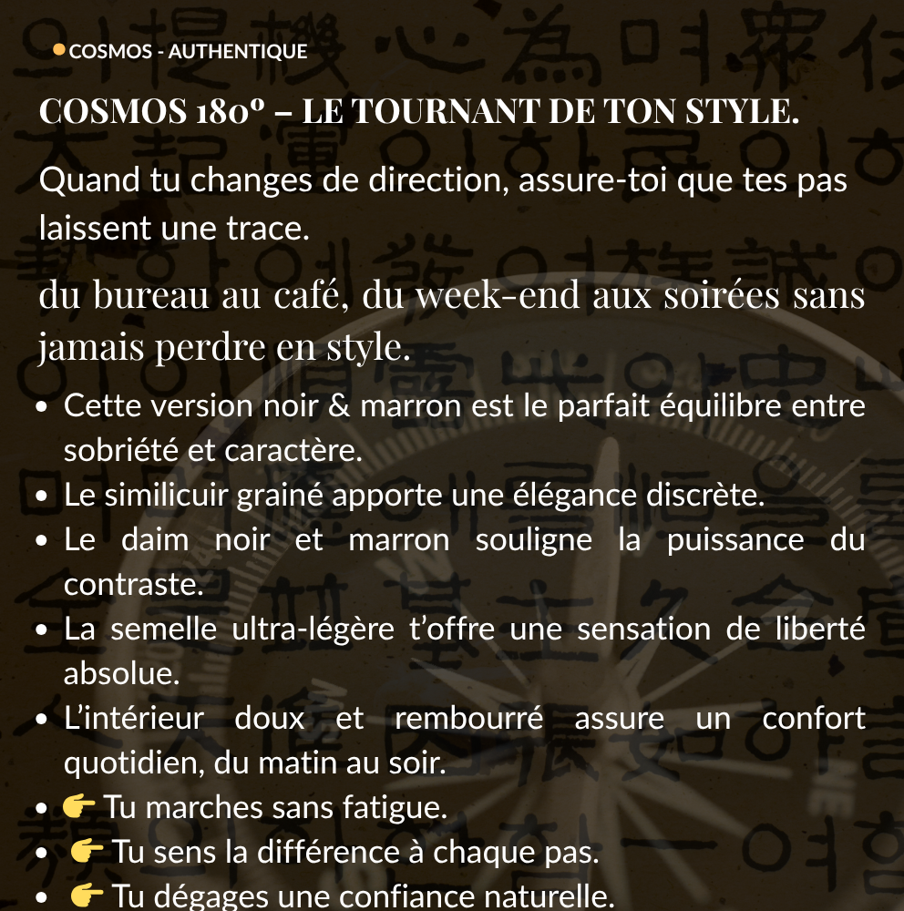 Je suis bluffé par la qualité des finitions et la légèreté des chaussures COSMOS. Elles vont avec toutes mes tenues et je peux les porter toute la journée sans aucune gêne. Bravo pour cette belle réussite algérienne