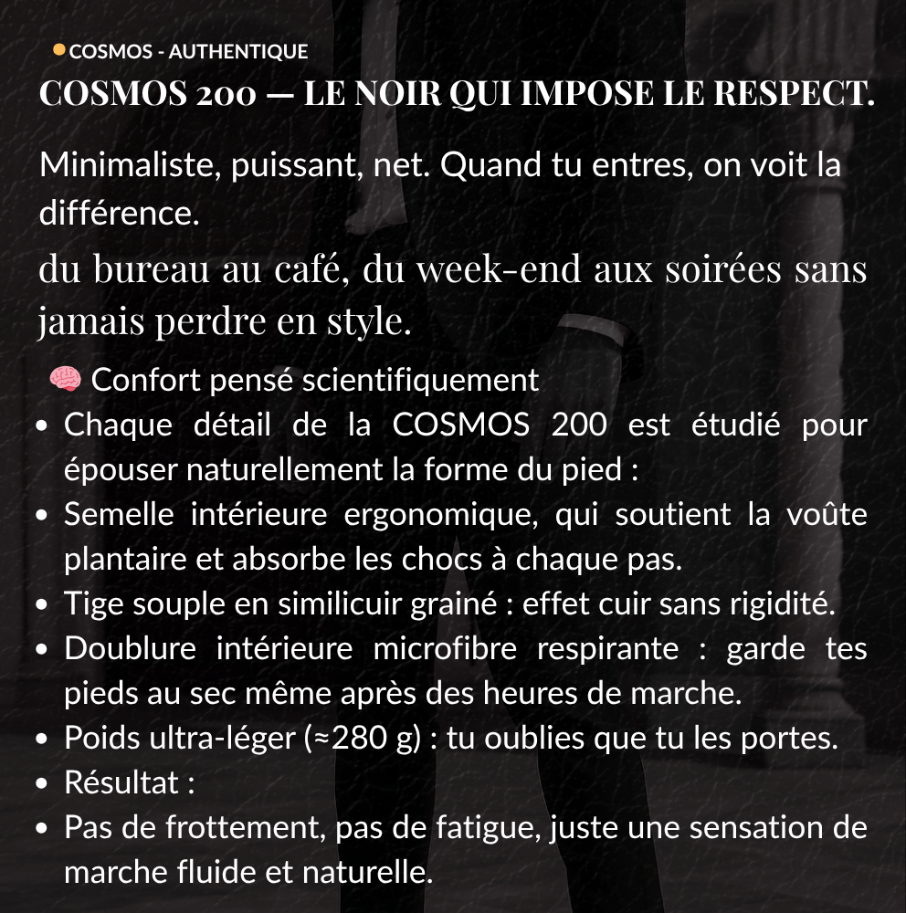 Je suis bluffé par la qualité des finitions et la légèreté des chaussures COSMOS. Elles vont avec toutes mes tenues et je peux les porter toute la journée sans aucune gêne. Bravo pour cette belle réussite algérienne